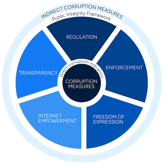 We proxy those here as parts of a public integrity framework consisting of Corruption Measures, Transparency, Regulation , Enforcement, Freedom of Expression and Internet Empowerment . We also include direct indicators of corruption.
